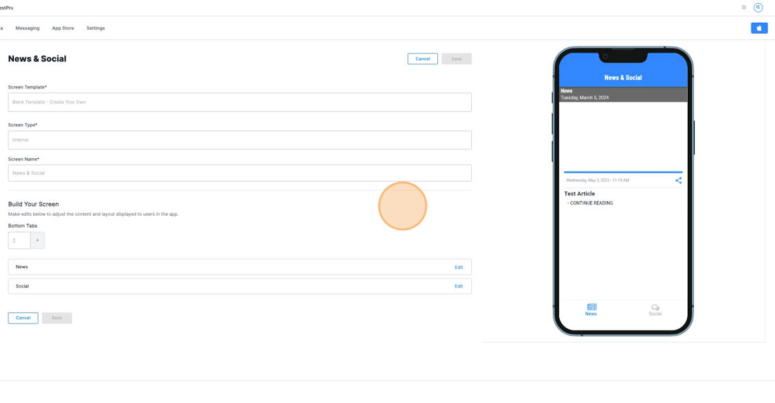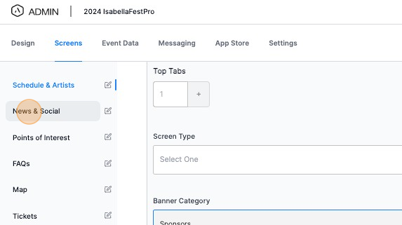 3. Click the button that houses the screens you would like to add rotating banners to. In this example, we are using News & Social, but you can do the same steps with most of your buttons.